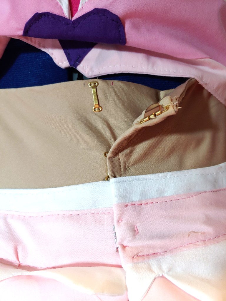 Now you have a fully full skirt with all the shiny accents and a finished waistband, it’s time to finish off the back with some clasps. The slider buckles or hooks and eyes are optimal for a basque as they don’t risk popping up with strain or weight. These types of clasps are used in ballet pancake tutus for much the same reason.