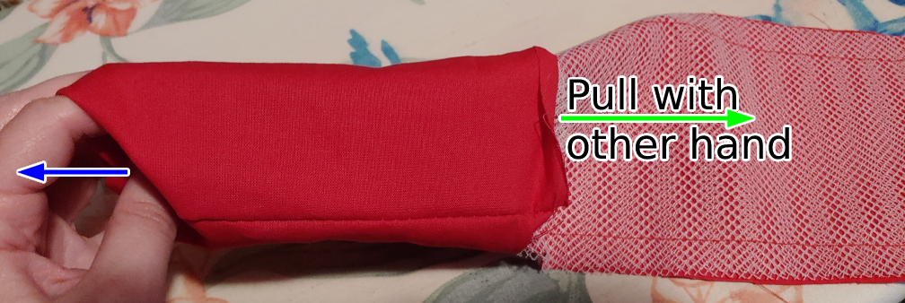 Reach into the tube and pinch some of the fabric, gently pulling it out of the tube while pulling the end of the fabric down with your other hand. Keep doing this until you have turned the entire bow.