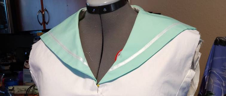 At this point, it’s a tie set. We have too many words. Regardless, ideally, you could sew some ribbon or bias tape to the tie set and have it snap or velcro in the back underneath the sailor collar.