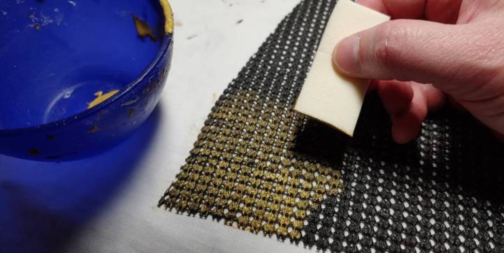 Shelf liner takes quite a bit of paint to be noticeable but if you put too much on, your paint will start seeping through the holes and it’ll look more solid than maille once you’re done.