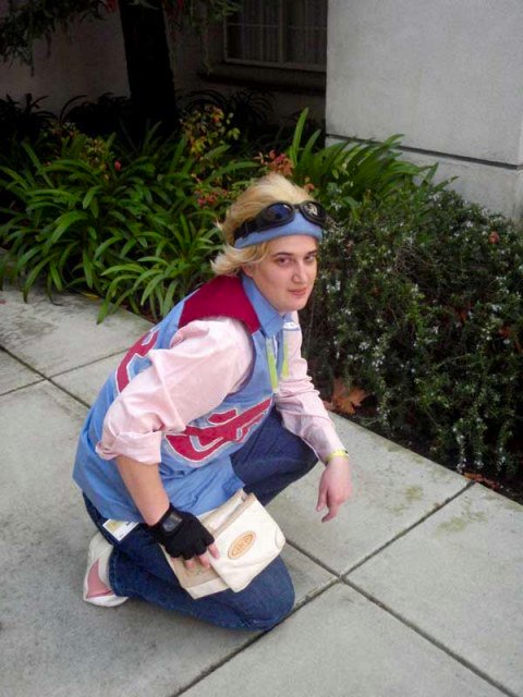 I assembled this outfit right when Final Fantasy XIII came out. It was a pretty comfy cosplay (aside from a poor choice of shoes) and I had a ton of pockets with the work pouches. This one required a bit of work to match the character, which included removing the sleeves of the blue shirt, adding a red patch of fabric, and painting the designs. The early drawings showed his shirt as blue, so I went with that one instead of the black.