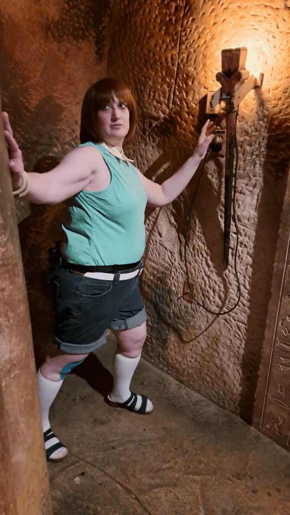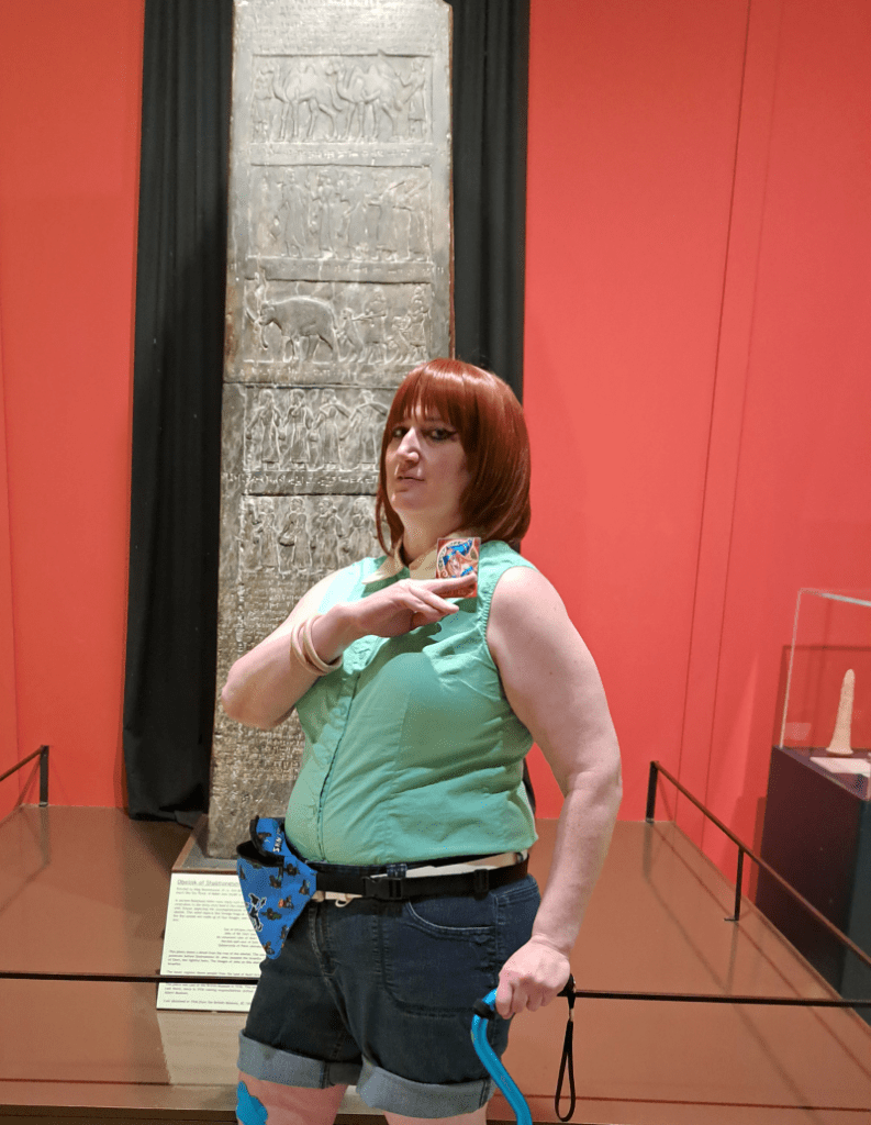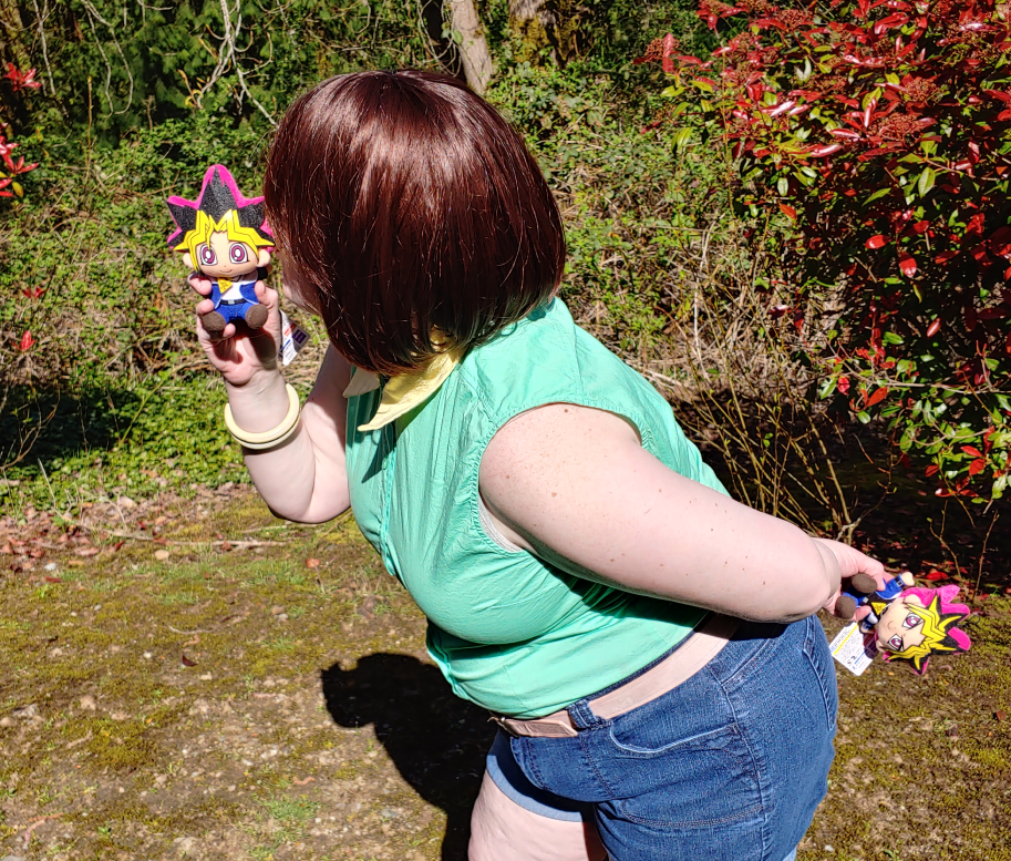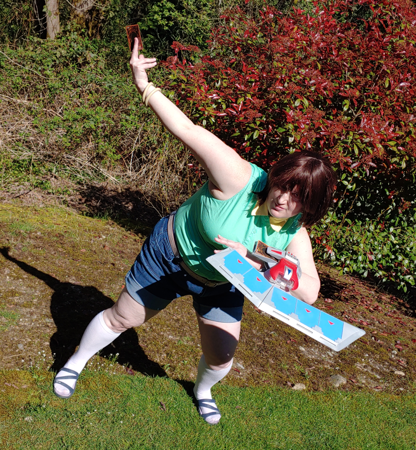 I debated on what outfit to cosplay and got really lucky at a thrift store one day, finding a spandex sleeveless shirt in bright 90s anime green. I modified this outfit very little, only swapping the collar to a yellow one. I’ve cosplayed this outfit for a few years now, and I change the wig, belt, and bracelets depending on what I find in my closet at the time. This is easily my most worn thrifted cosplay.
